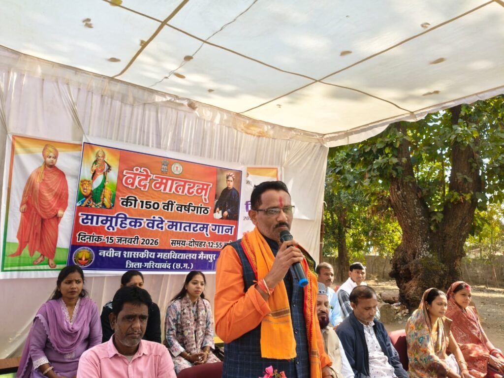 मैनपुर । राष्ट्रीय गीत वंदे मातरम के 150वीं वर्षगांठ पूरी होने पर नवीन शासकीय महाविद्यालय मैंनपुर में वंदे मातरम राष्ट्रीय गीत के सामूहिक गान का आयोजन किया गया जिसमें मुख्य अतिथि महाविद्यालय के जन भागीदारी के अध्यक्ष योगेश शर्मा ने छात्र-छात्राओं को संबोधित करते हुए कहा कि