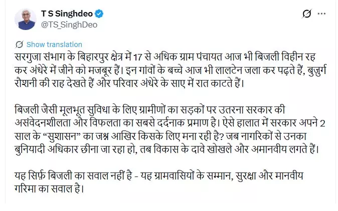 टीएस सिंहदेव ने कहा कि विकास के बड़े-बड़े दावों के बीच यह सच्चाई बेहद चिंताजनक है। उन्होंने बताया कि इन गांवों में बच्चे आज भी रात के समय लालटेन जलाकर पढ़ाई करते हैं। बुज़ुर्गों की आंखें रोशनी को तरस रही हैं और परिवार अंधेरे के साए में अपनी रातें काटने को मजबूर हैं। बिजली जैसी बुनियादी सुविधा का अभाव इन इलाकों के सामाजिक और शैक्षणिक विकास में सबसे बड़ी बाधा बन गया है।
